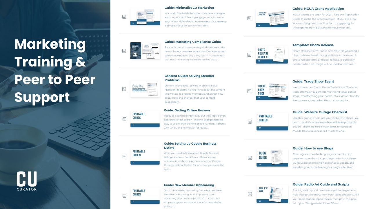 - Peer-to-Peer Support: Monthly brainstorming calls + community of CU marketers